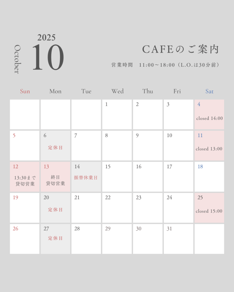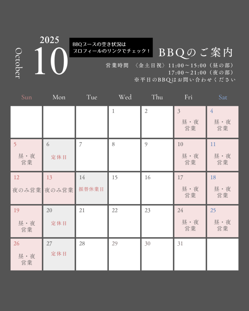 10月の休業日・営業変更のお知らせ いつも当店をご利用いただきありがとうございます。 10月の休業日、営業変更についてお知らせします。 皆様のお越しをお待ちしております! ※10月12日のCAFEは、貸切終了後、準備が整い次第14:30頃にオープンいたします。(時間が前後する可能性あり) >>BBQの空き状況カレンダーはこちら