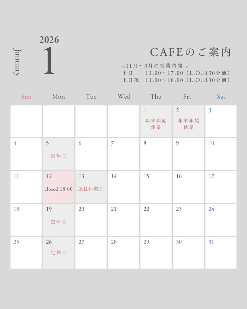 1月の休業日・営業変更のお知らせ いつも当店をご利用いただきありがとうございます。 1月の休業日、営業変更についてお知らせします。 皆様のお越しをお待ちしております! ※11月~3月は、平日の営業時間が11:00~17:00(L.O.16:30)となります。 ※BBQは11月~3月は冬季休業いたします。