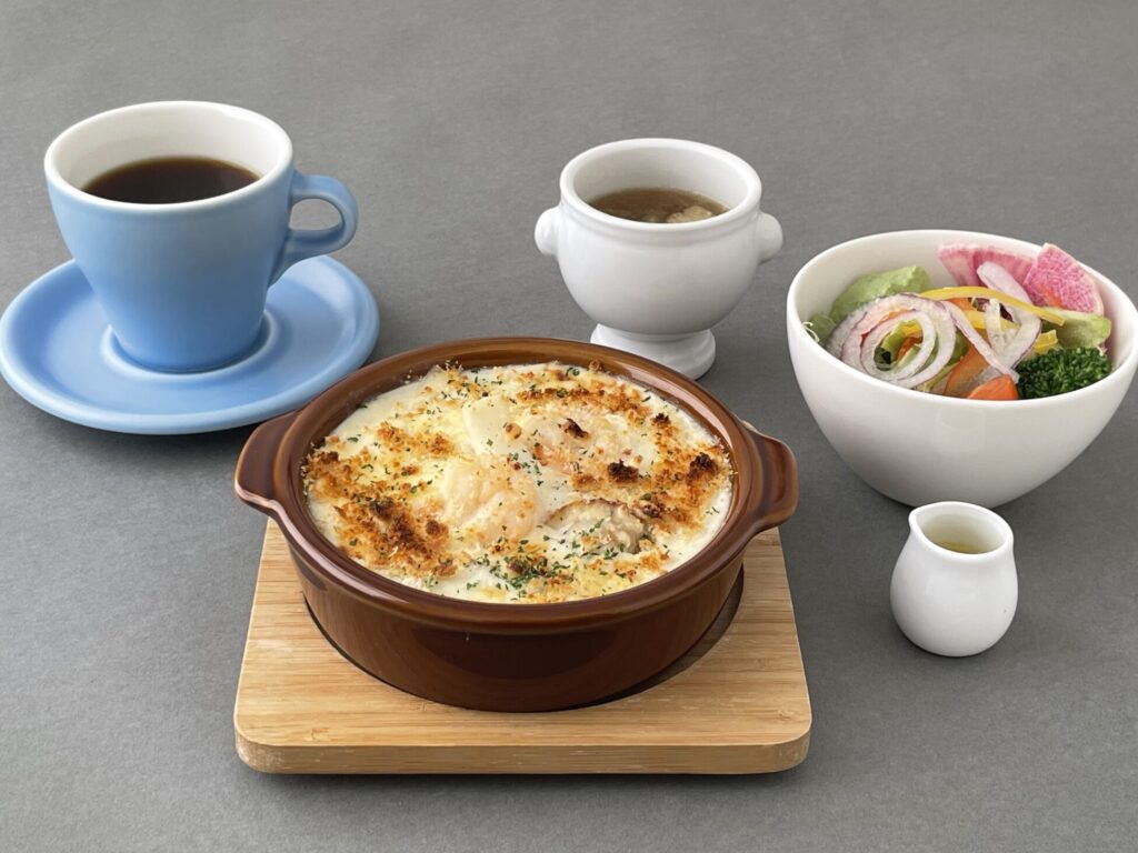 〖期間限定〗シーフードドリア新登場! ランチメニューに、「シーフードドリア」が新登場!イカ・エビ・ホタテの旨味を閉じ込め、県産牛乳の濃厚なベシャメルソースとチーズで香ばしく焼き上げた、寒い季節にぴったりの一皿です。 サラダ・スープ・ドリンクのついたセットメニューがおすすめです。ご来店をお待ちしております。 【1月31日から販売開始】
