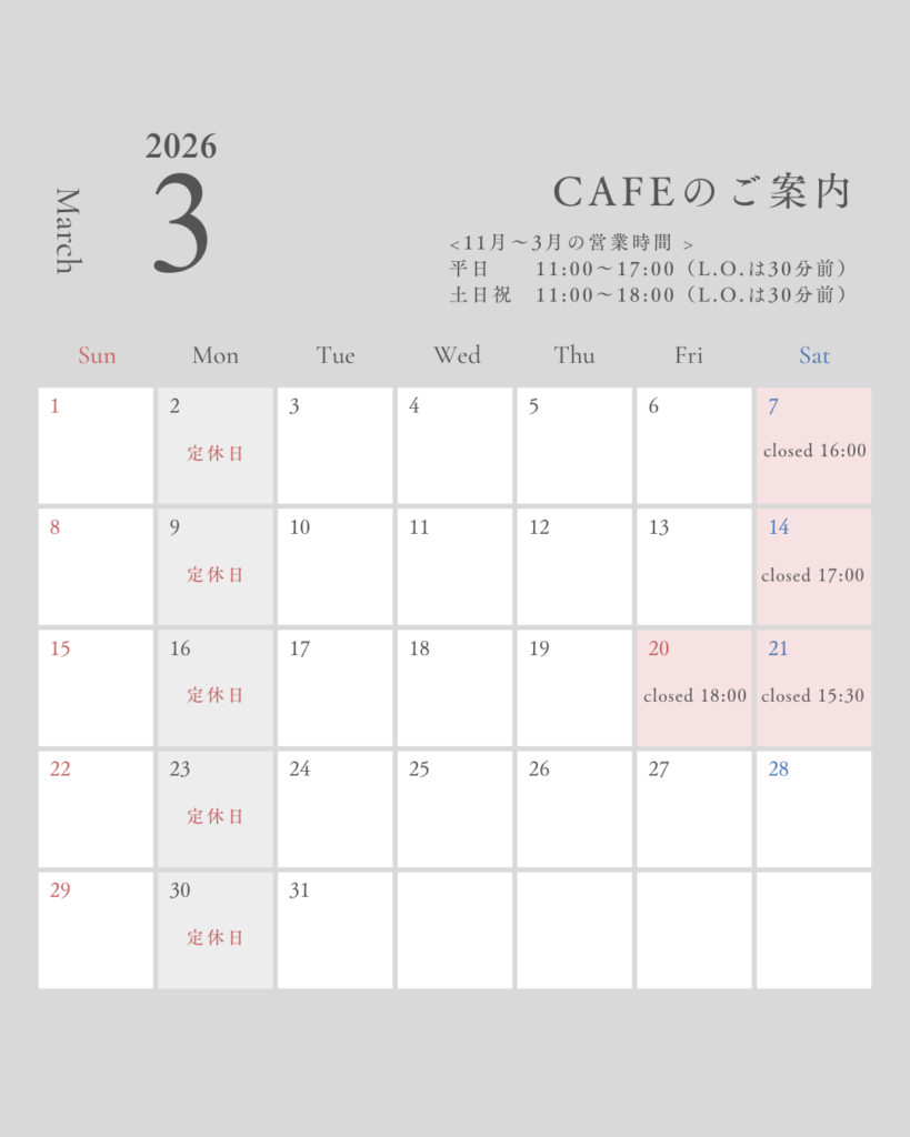 3月の休業日・営業変更のお知らせ いつも当店をご利用いただきありがとうございます。 3月の休業日、営業変更についてお知らせします。 皆様のお越しをお待ちしております! ※11月~3月は、平日の営業時間が11:00~17:00(L.O.16:30)となります。 ※BBQは11月~3月は冬季休業いたします。
