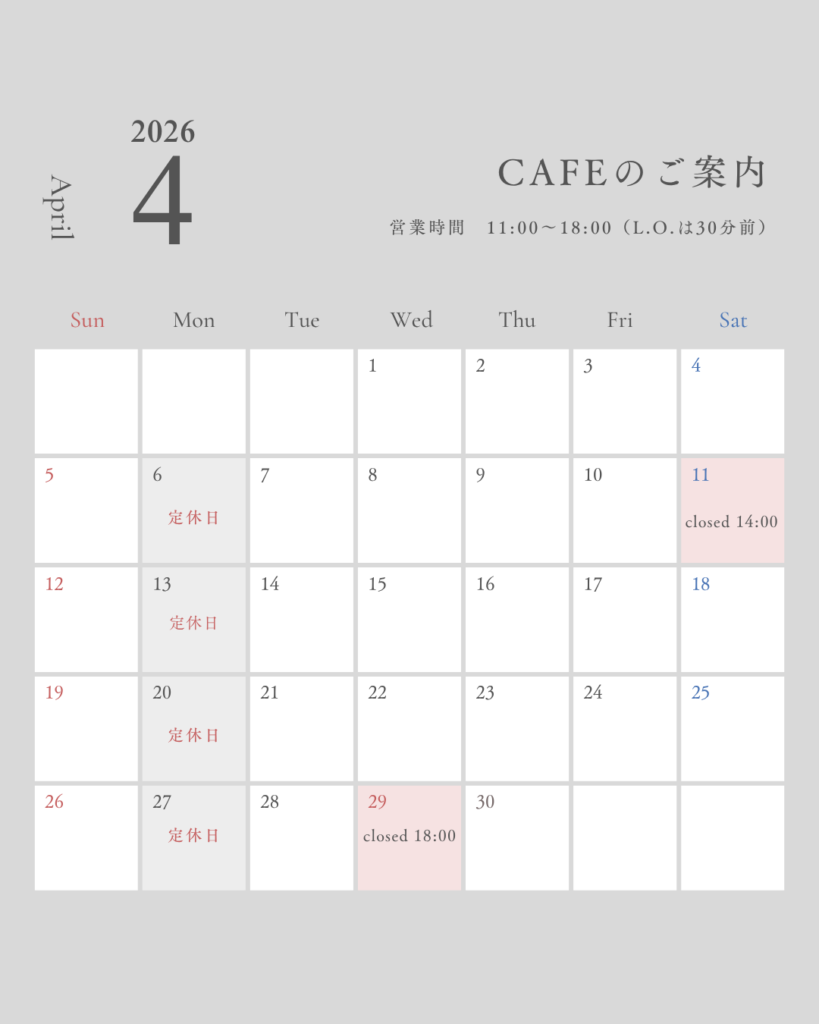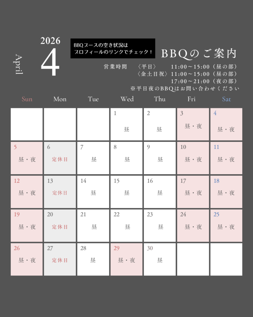 4月の休業日・営業変更のお知らせ いつも当店をご利用いただきありがとうございます。 4月の休業日、営業変更についてお知らせします。 皆様のお越しをお待ちしております! >>BBQの空き状況カレンダーはこちら