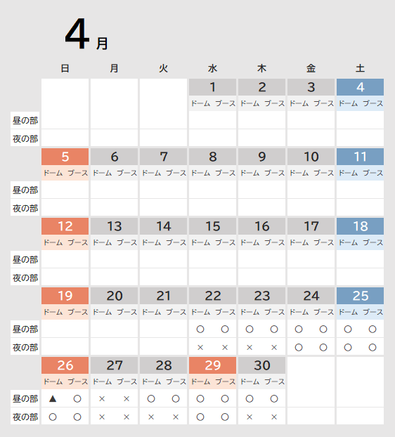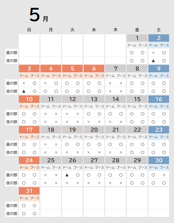 お日にちの空き状況をご参考いただき、お問合せお待ちしております。